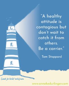 “Elk mens is uniek, maar bij veel aandoeningen en ziektes wordt ervan uitgegaan dat een ziekte of klacht bij ieder mens een voorspelbaar en gelijkaardig verloop heeft. Toen mijn man Bart jaren geleden gediagnosticeerd werd met Non-Hodgkin lymfoom, heeft hij de artsen nooit naar zijn prognose gevraagd. Zijn huisarts, een heel bekwaam man, gaf hem als advies mee om te luisteren naar de diagnose, niet naar de prognose, want die bestaat slechts bij het gemiddelde. Het probleem bij een prognose is dat die door sommige mensen al eens heel letterlijk wordt overgenomen. Stel dat de meeste mensen met Non-Hodgkin gemiddeld nog zes maanden te leven hebben en die bewering als waarheid aannemen, dan bestaat de kans dat ze daar effectief naar gaan leven. Je gedachten krijgen daarmee invloed op je genezingsproces. Hoe je reageert op een diagnose of op de woorden van een zorgverlener, heeft dus vooral te maken met je eigen overtuigingen. Word je daarom bewust van het effect van de woorden van een zorgverlener. Voelen ze niet helend, dan zijn ze ook niet helend. En dan mag je heel kritisch zijn op die woorden.” (citaat interview uit boek ‘Van droge naar blije doos.’)